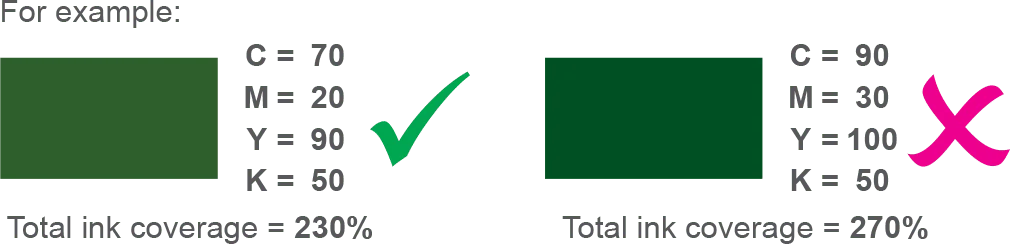 - For Litho Offset and Digital offset, maximum total ink coverage must not more than 240%. Too much ink coverage may dirty mark printing (sheet sticking together and caused text or image to look blurred).