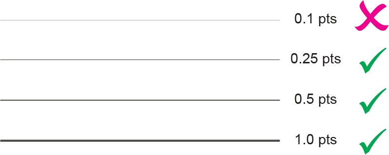 - DO NOT set line weight less than 0.25pts. (Not applicable for Pre-Inked Stamp, Spot UV & Hot-Stamping – refer to Pre-Inked Stamp, Spot UV & Hot-Stamping section for details)
