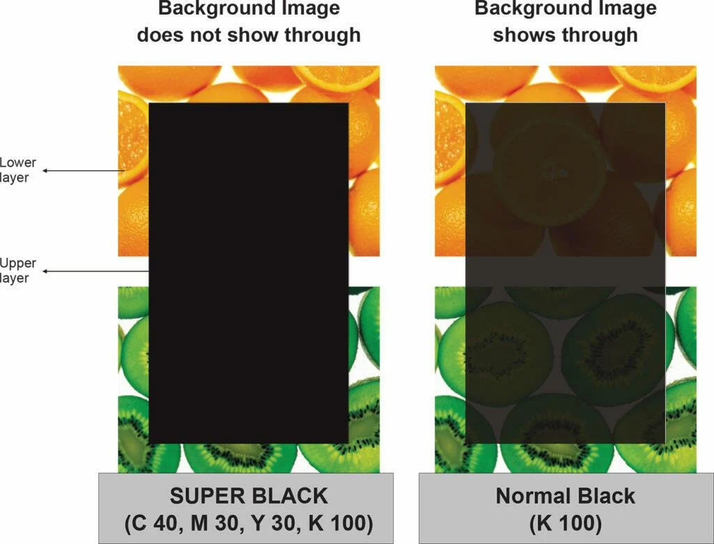 When a large solid black (100%K) area is required on a 4 color process job, we recommend to build the black in SUPER BLACK which has a mix of C 40, M 30, Y 30, K 100 . It will make the black denser onto an image if you want your background image not to show through.