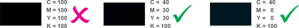 - DO NOT set black colour to (C=100 M=100 Y=100 K=100) Too much ink coverage may result in sheets sticking together and caused text or image to look blurred. To get the most from black, use the colour combinations stated below*: