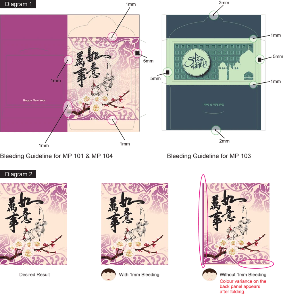 3. If your design contains different background colour for front panel, back panel or slit flap, you are REQUIRED to allow 1mm bleed. The outcome is shown below in Diagram 2. Expressprint shall not be held responsible for the visibility of the colour variance between the panels of the money packet.