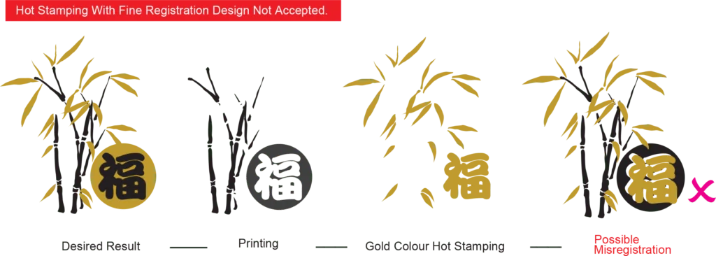 Fine registration artwork is NOT allowed (artwork refer to the Hot Stamping Artwork Specification). We shall Not Accept any Rejection on Fine Registration Artwork. Tolerance : ± 1.5 mm (due to die cutting, gluing and folding process)