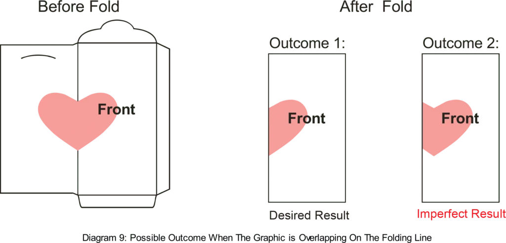However, tolerance for hot stamping is ± 1.5mm. It has tendecy of artwork appear to other panel. Hence, it is advisable that important item is within safe zone. (Refer Precaution on artwork: Avoid extended graphic overlapping on the folding line)