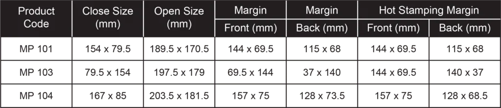 – 2mm non-hot stamping area from top flap trim line for MP101 and MP 104